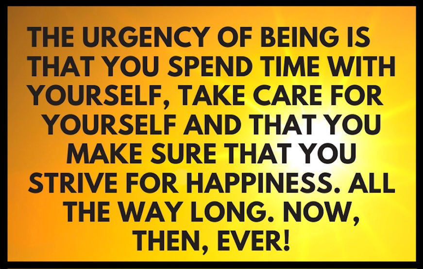 “The urgency of being is that you spend time with yourself, take care for yourself and that you make sure that you strive for happiness. All the way long. Now, then, ever!” — Unknown Author