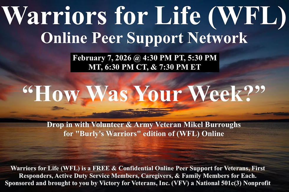 Warriors for Life (WFL) Peer Support Network Online "Burly's Warriors" edition, presented by Victory for Veterans, Inc. (VFV) — (TONIGHT), February 7, 2026 @ 4:30 PM PT, 5:30 PM MT, 6:30 PM CT, & 7:30 PM ET