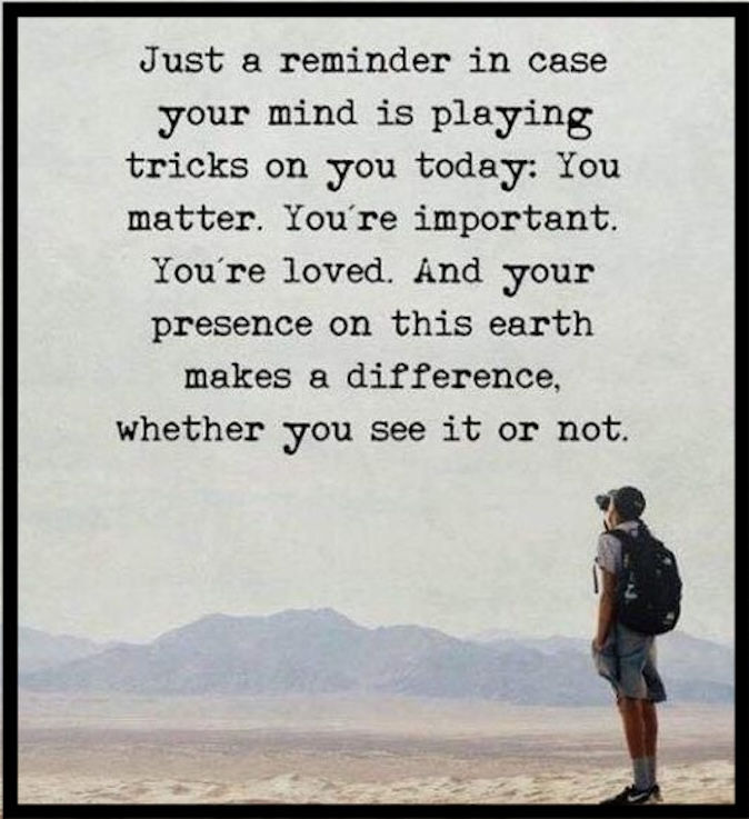 “Just a reminder in case your mind is playing tricks on you today: You matter. You’re important. You’re loved. And your presence on this earth makes a difference, whether you see it or not.” — Unknown Author