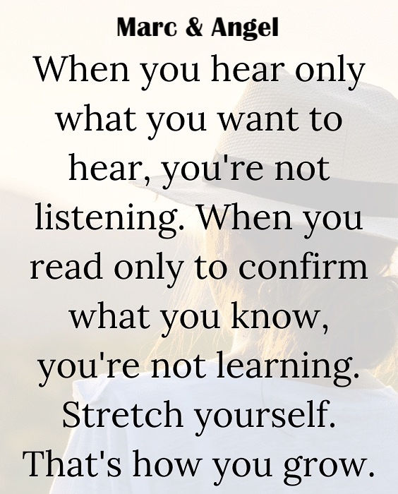 “When you hear only what you want to hear, you’re not listening. When you read only to confirm what you know, you’re not learning. Stretch yourself. That’s how you grow.” — Marc & Angel