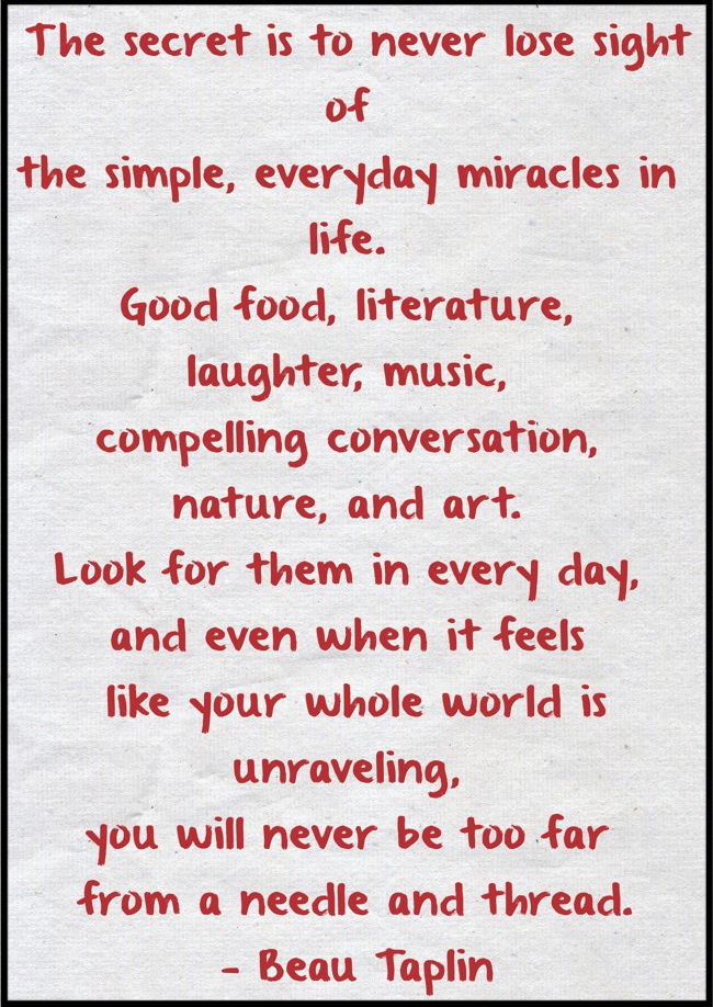 “The secret is to never lose sight of the simple, everyday miracles in life. Good food, literature, laughter, music, compelling conversation, nature, and art. Look for them in every day, and even when it feels like your whole world is unraveling, you will never be too far from a needle and thread.” — Beau Taplin